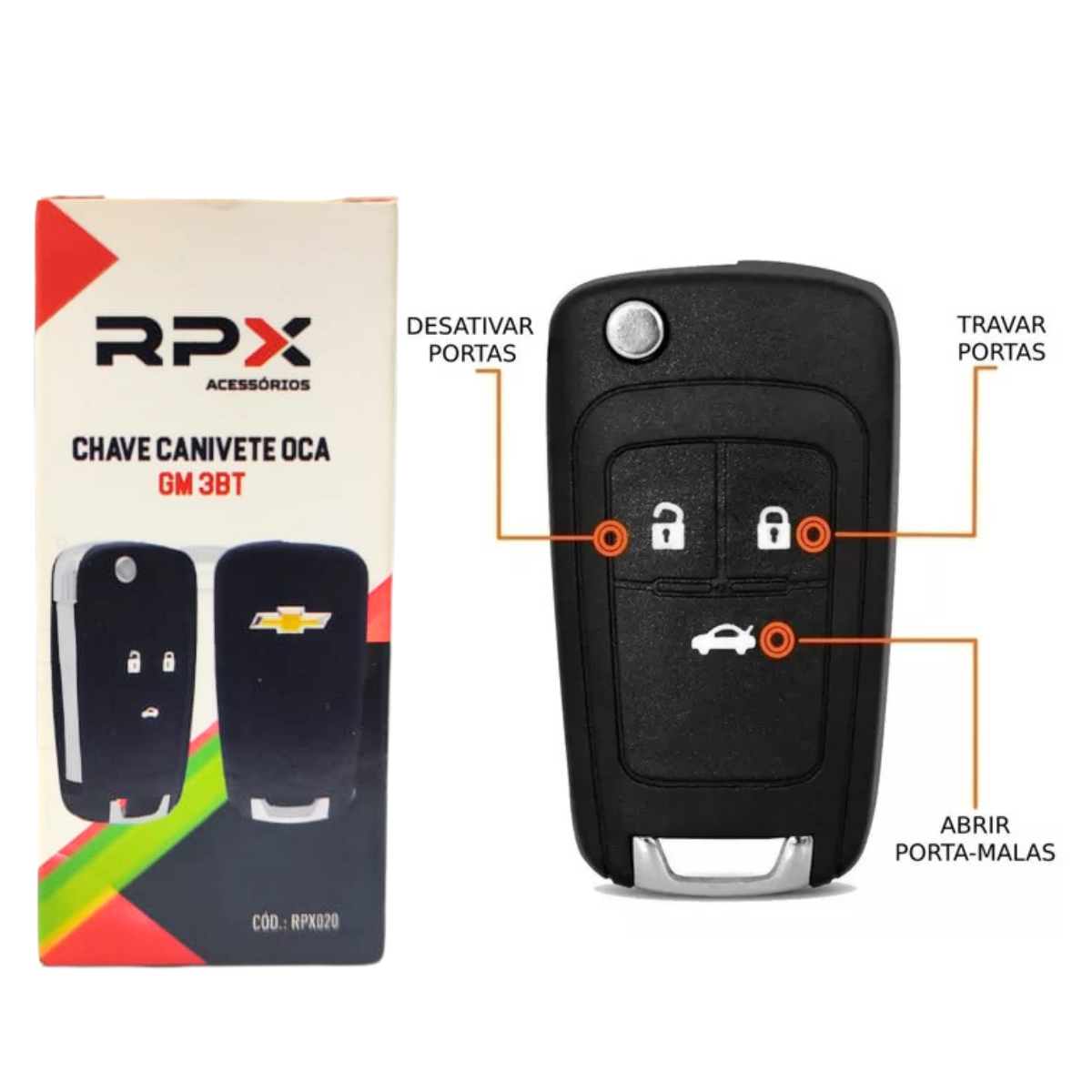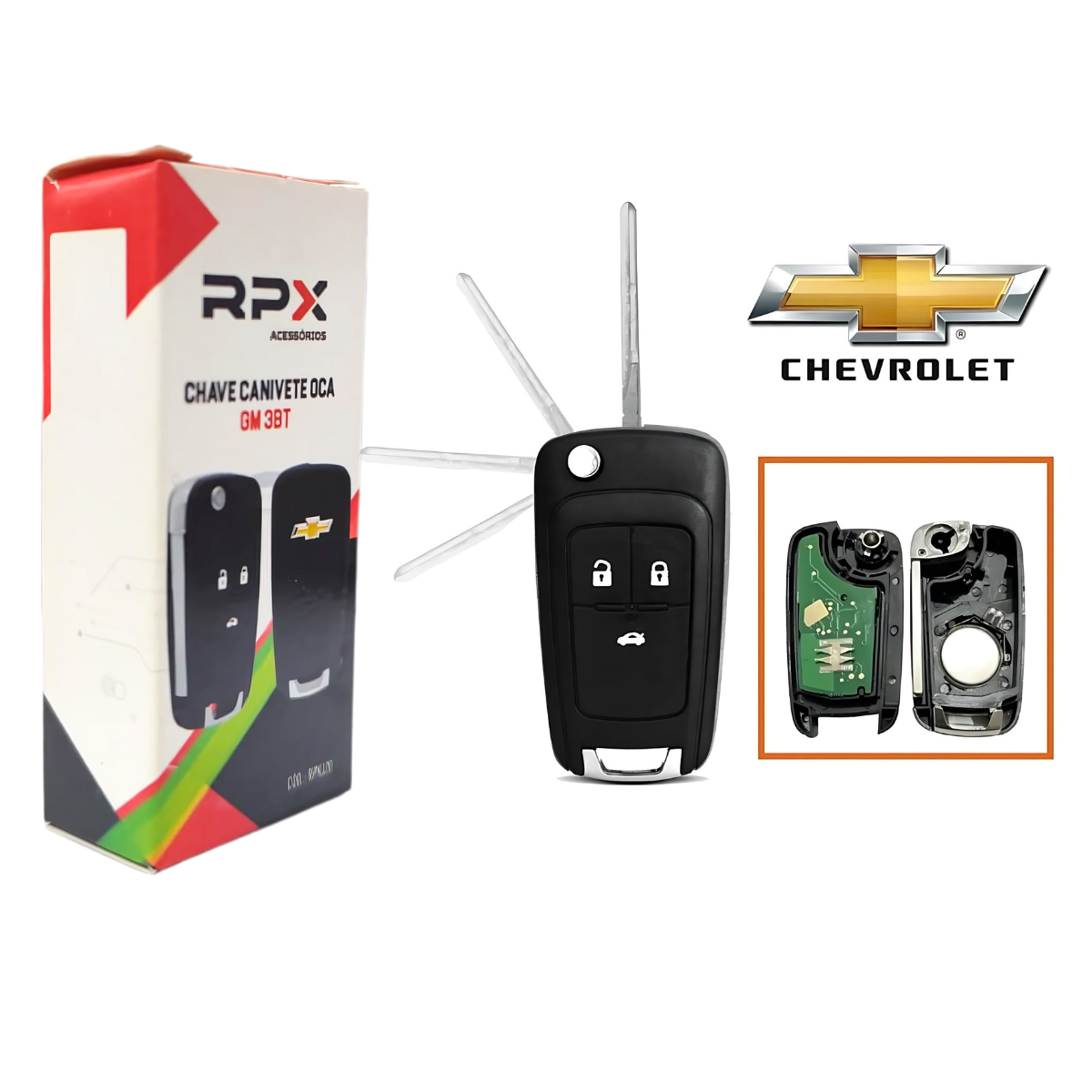 A “Chave Canivete Oca GM 3BT” da RPX é uma carcaça de substituição para chaves de veículos Chevrolet com três botões. Projetada para acomodar o circuito eletrônico original da sua chave, ela é compatível com diversos modelos da Chevrolet, incluindo: