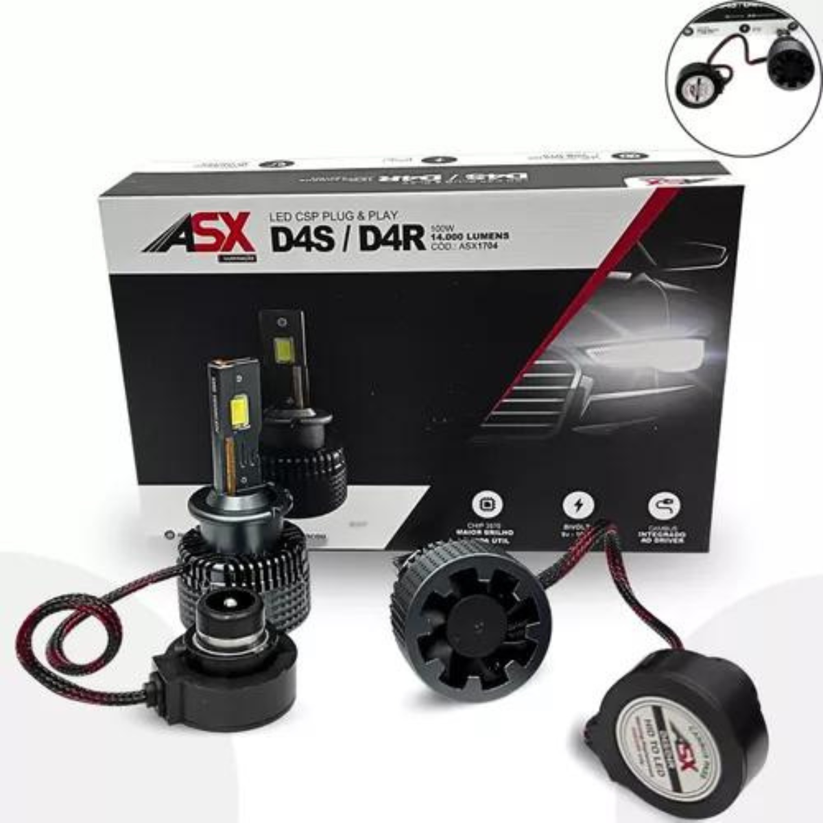 DESCRIÇÂO -Projetor Exclusivo ASX -Chip CSP 3570 -Eficiência Lumens SA 100 Wats 14.000 Lumens -Longa Vida Util Alcançando até 50 mil horas -Tensão de operação de 9v – 100v -Resistente a agua e poeira -Emissao de luz estavel -Função Antiofuscante -Alcance de iluminação até 200% maior -Cambus integrado ao driver Obs: Não é necessário retirar o reator do veiculo o Led vai ligado nele igual o xênon original, substituindo somente e lâmpada.