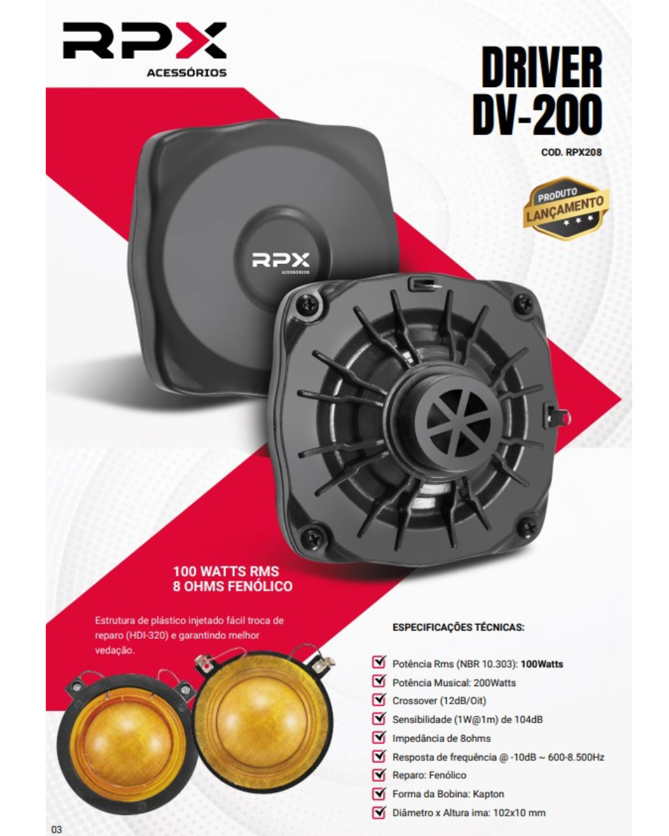 A potência sonora e a confiabilidade que você precisa, estão no driver RPX, 100 Watts RMS 8 OHMS fenólico, estrutura de plástico injetado fácil troca de repara (HDI-320) e garante melhor vedação.