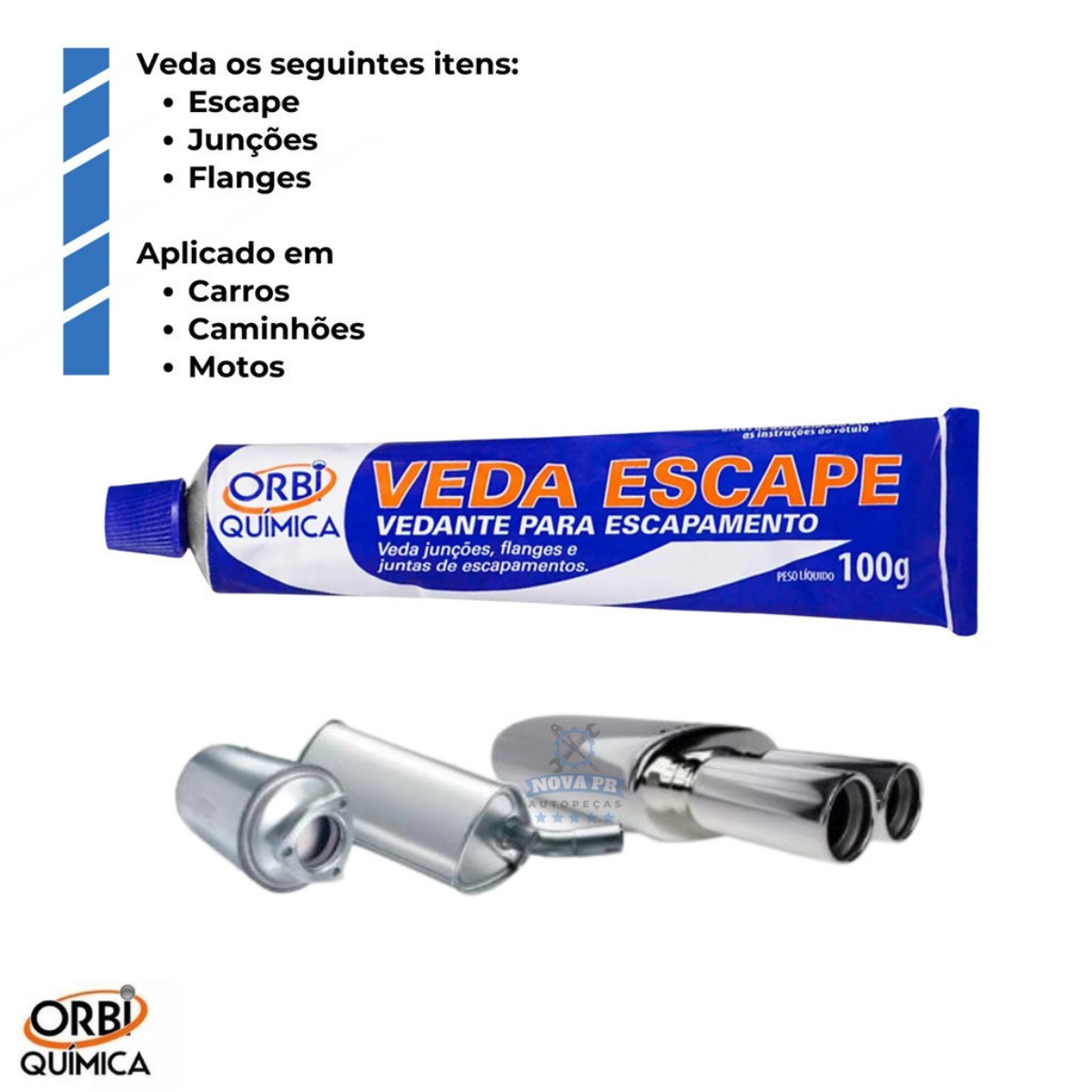 Veda junções, flanges e juntas de escapamentos. Elimina ruídos e vazamentos da tubulação do escape. Resiste à vibrações e altas temperaturas. Não inflamável.