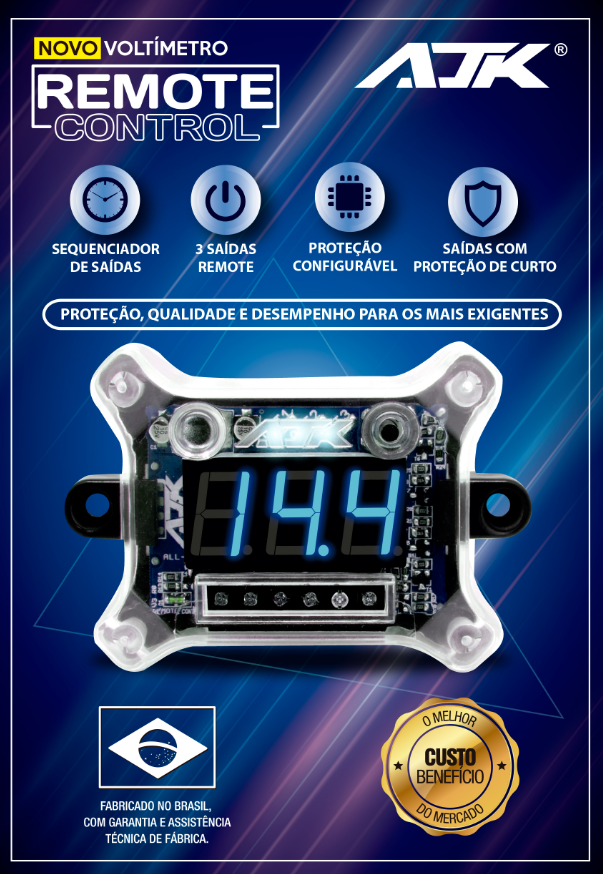 O Voltímetro Digital Remote Control V3 da marca AJK é um instrumento de medição de voltagem utilizado em veículos automotivos e outros sistemas elétricos.
